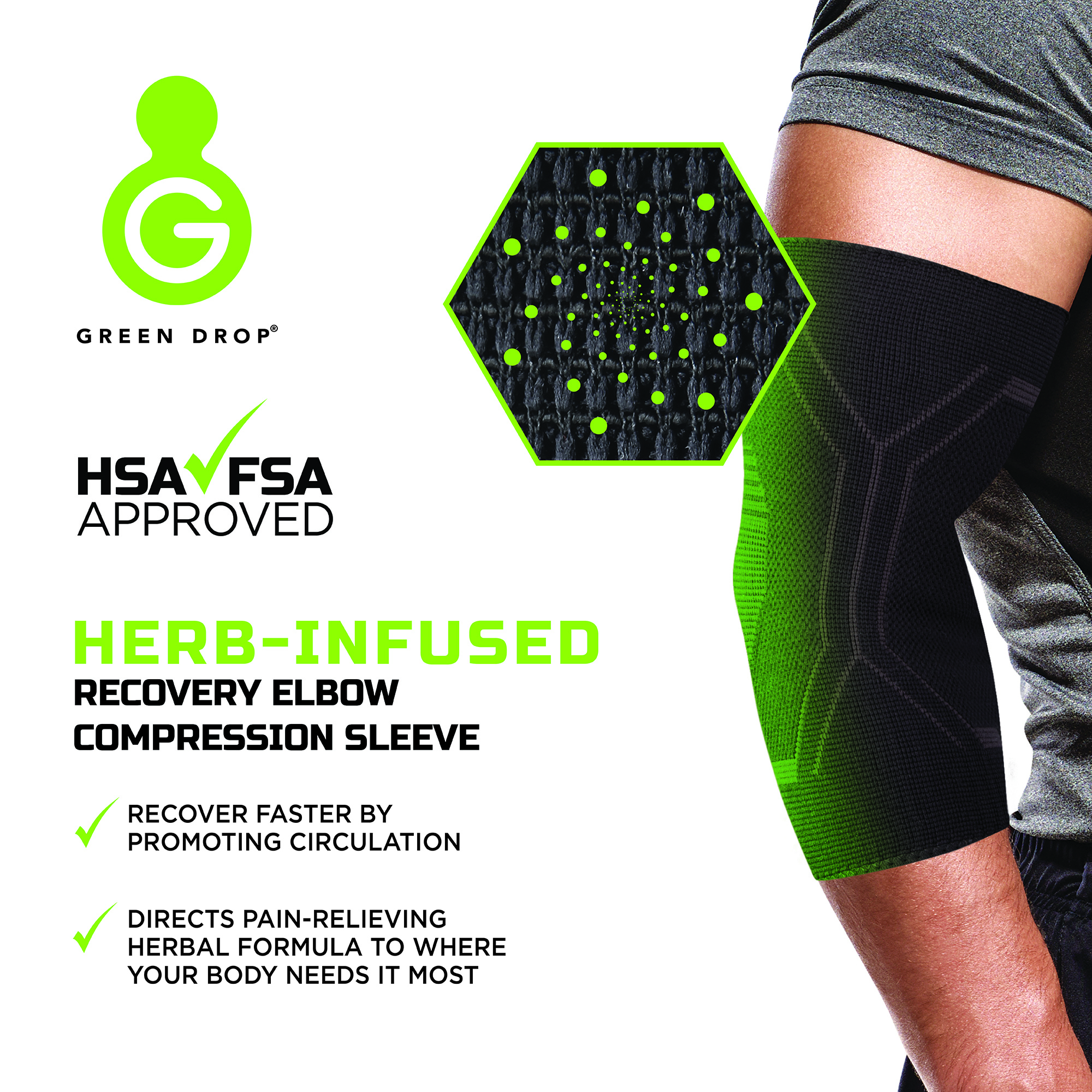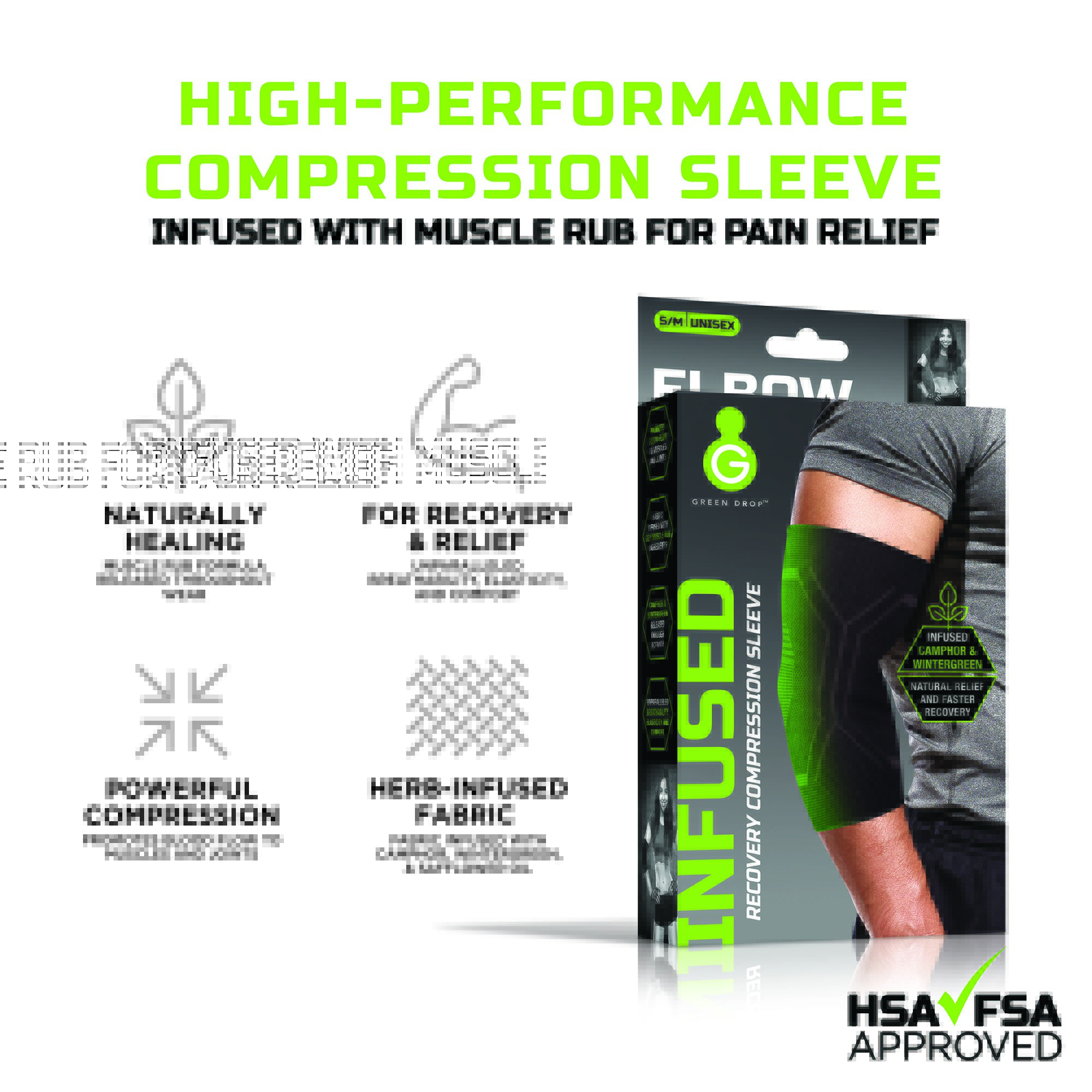 - High Performance Compression: Green Drop introduces a cutting-edge elbow recovery sleeve designed to address muscle and joint soreness, ensuring optimal support and mobility for individuals with physically demanding routines